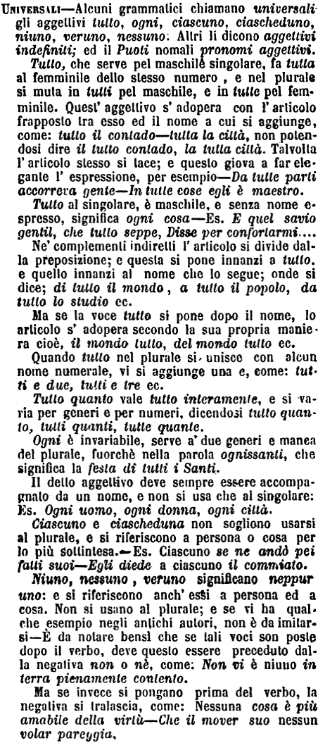 | Universali - Alcuni grammatici chiamano universali gli aggettivi tutto, ogni, ciascuno, ciascheduno, niuno, veruno, nessuno. Altri li dicono aggettivi indefiniti; ed il Puoti nomali pronomi aggettivi.