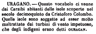 | Uragano - Questo vocabolo ci venne dai Caraibi abitanti delle isole scoperte nel secolo decimoquinto da Cristoforo Colombo. Quelle isole sono soggette ad esser molto maltrattate dai turbini di vento impetuoso, che dagli indigeni erano detti ouragan. [immagine] |