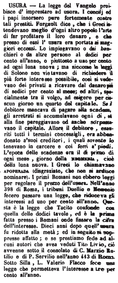 | Usura - I Romani chiamavano Usura l'interesse del denaro, che prestavano, senza ripeterlo mai. Era tra loro un commercio come tra i Greci, che quantunque permesso non era meno ingiusto di per sè stesso, nè meno odioso ai Cittadini onorati. È uno strozzar l'uomo, diceva Catone, il prestargli ad usura. L'interesse il più comune era dell'uno per mese, ed in conseguenza il dodici per cento l'anno, in guisa che per poco che un Debitore si trovasse nell'impossibilità di pagare, i frutti si cumulavano in poco tempo; e ciò che portava al colmo l'ingiustizia si è che ordinariamente si esigeva l'anatocismo vale a dire il frutto de' frutti o il frutto e rifrutto. Si può vedere nell'Articolo Imprestiti con qual rigore i Greci e i Romani trattassero i lor Debitori. Questo fu spinto in Roma tant'oltre che fu obbligato il Governo di promulgare diverse Leggi per porre un freno alla cupidigia de' Creditori imprestanti certi limiti alle lor vessazioni; ma quasi sempre ciò avvenne senza nessun favorevole resultamento. Gli usuraj Romani sapevano impiegar come i nostri de' mezzi sottili ed artificiosi per mettersi al coperto delle pene che la Legge minacciava, e infliggeva. (V. Centesimae, Versura). |