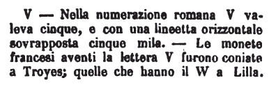 | V - Nella numerazione romana V valeva cinque, e con una lineetta orizzontale sovrapposta cinque mila. - Le monete francesi aventi la lettera V furono coniate a Troyes; quelle che hanno il W a Lilla. [immagine] |
