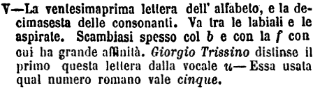 | V - La ventesimaprima lettera dell'alfabeto, e la decimasesta delle consonanti. Va tra le labiali e le aspirate. Scambiasi spesso col b e con la f con cui ha grande affinità. Giorgio Trissino distinse il primo questa lettera dalla vocale u - Essa usata qual numero romano vale cinque. [immagine] |