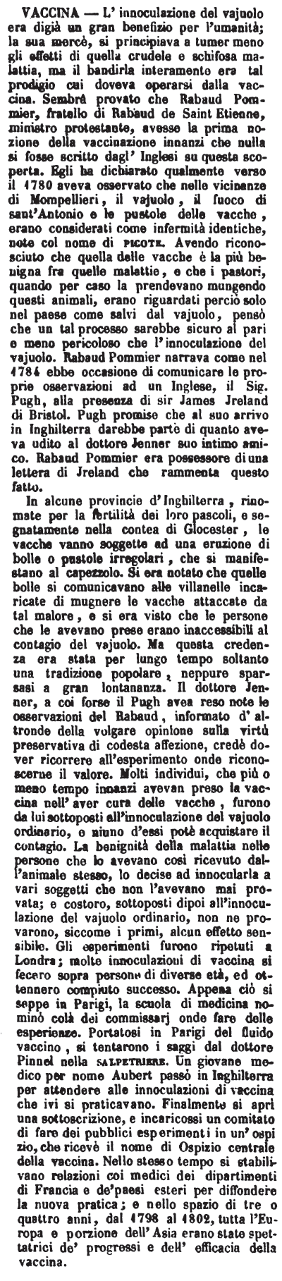 Vaccina - L'innoculazione del vajuolo era digià un gran benefizio per l'umanità; la sua mercè, si principiava a tumer meno gli effetti di quella crudele e schifosa malattia, ma il bandirla interamente era tal prodigio cui doveva operarsi dalla vaccina. Sembra provato che Rabaud Pommier, fratello di Rabaud de Saint Etienne, ministro protestante, avesse la prima nozione della vaccinazione innanzi che nulla si fosse scritto dagl'Inglesi su questa scoperta. Egli ha dichiarato qualmente verso il 1780 aveva osservato che nelle vicinanze di Mompellieri, il vajuolo, il fuoco di sant'Antonio e le pustole delle vacche, erano considerati come infermità identiche, note col nome di picote. Avendo riconosciuto che quella delle vacche è la più benigna fra quelle malattie, e che i pastori, quando per caso la prendevano mungendo questi animali, erano riguardati perciò solo nel paese come salvi dal vajuolo, pensò che un tal processo sarebbe sicuro al pari e meno pericoloso che l'innoculazione del vajuolo. Rabaud Pommier narrava come nel 1784 ebbe occasione di comunicare le proprie osservazioni ad un Inglese, il Sig. Pugh, alla presenza di sir James Jreland di Bristol. Pugh promise che al suo arrivo in Inghilterra darebbe parte di quanto aveva udito al dottore Jenner suo intimo amico. Rabaud Pommier era possessore di una lettera di Jreland che rammenta questo fatto.