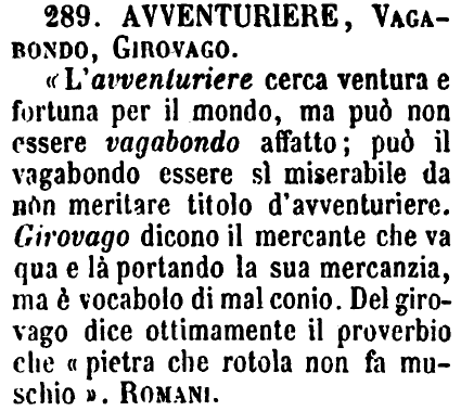 | Avventuriere, Vagabondo, Girovago - «L'avventuriere cerca ventura e fortuna per il mondo, ma può non essere vagabondo affatto; può il vagabondo essere sì miserabile da non meritare titolo d'avventuriere. Girovago dicono il mercante che va qua e là portando la sua mercanzia, ma è vocabolo di mal conio. Del girovago dice ottimamente il proverbio che «pietra che rotola non fa muschio.» Romani. [immagine] |