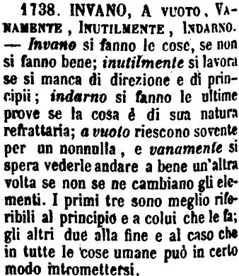 | Invano, A vuoto, Vanamente, Inutilmente, Indarno - Invano si fanno le cose, se non si fanno bene; inutilmente si lavora se si manca di direzione e di principii; indarno si fanno le ultime prove se la cosa è di sua natura refrattaria; a vuoto riescono sovente per un nonnulla; e vanamente si spera vederle andare a bene un'altra volta se non se ne cambiano gli elementi. I primi tre sono meglio riferibili al principio e a colui che le fa; gli altri due alle fine e al caso che in tutte le cose umane può in certo modo intromettersi. [immagine] |