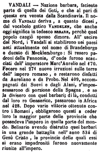 | Vandali - Nazione barbara, faciente parte di quella dei Goti, e che al pari di questa era venuta dalla Scandinavia. Il nome di Vandali deriva, a quanto dicesi, dal vocabolo gotico Vandelen, che anche oggi significa in tedesco errare, perchè quel popolo cangiò spesso dimora. All'uscire dal Nord, i Vandali si stabilirono nei paesi noti attualmente col nome di Brandeburgo e ducato di Mecklemburgo: Si resero padroni della Pannonia, d'onde furono scacciati dall'imperatore Marc'Aurelio nel 170. Fecero nel 271 nuove irruzioni sulle terre dell'impero romano, e restarono disfatti da Aureliano e da Probo. Nel 409, accompagnati dai Suevi e dagli Alani, s'impossessarono di porzione della Spagna, e se la divisero con quei barbari; di là, condotti dal loro re Genserico, passarono in Africa nel 428. Dopo varie vittorie ottenute contro i Romani, obbligarono questi a ceder loro la maggior parte delle provincie che possedeva l'impero in quella parte del mondo. Belisario avendo distrutto quei barbari in una grande battaglia nell'anno 534 di Gesù Cristo, le provincie delle quali essi si erano impadroniti furono nuovamente riunite all'impero. [immagine] |