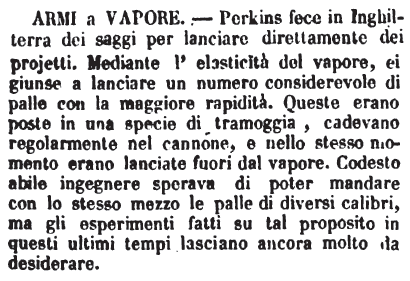 | Armi a vapore - Perkins fece in Inghilterra dei saggi per lanciare direttamente dei projetti. Mediante l'elasticità del vapore, ei giunse a lanciare un numero considerevole di palle con la maggiore rapidità. Queste erano poste in una specie di tramoggia, cadevano regolarmente nel cannone, e nello stesso momento erano lanciate fuori dal vapore. Codesto abile ingegnere sperava di poter mandare con lo stesso mezzo le palle di diversi calibri, ma gli esperimenti fatti su tal proposito in questi ultimi tempi lasciano ancora molto da desiderare. [immagine] |