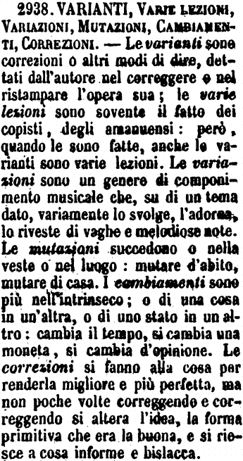 | Varianti, Varie lezioni, Variazioni, Mutazioni, Cambiamenti, Correzioni - Le varianti sono correzioni o altri modi di dire, dettati dall'autore nel correggere e nel ristampare l'opera sua; le varie lezioni sono sovente il fatto dei copisti, degli amanuensi: però, quando le sono fatte, anche le varianti sono varie lezioni. Le variazioni sono un genere di componimento musicale che, su di un tema dato, variamente lo svolge, l'adorna, lo riveste di vaghe e melodiose note. Le mutazioni succedono o nella veste o nel luogo: mutare d'abito, mutare di casa. I cambiamenti sono più nell'intrinseco; o di una cosa in un'altra, o di uno stato in un altro: cambia il tempo, si cambia una moneta, si cambia d'opinione. Le correzioni si fanno alla cosa per renderla migliore e più perfetta, ma non poche volte correggendo e correggendo si altera l'idea, la forma primitiva che era la buona, e si riesce a cosa informe e bislacca. [immagine] |