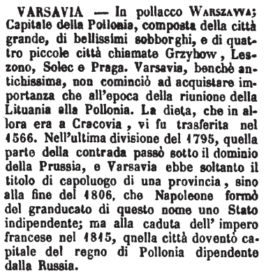 | Varsavia - In pollacco Warszawa; Capitale della Pollonia, composta della città grande, di bellissimi sobborghi, e di quattro piccole città chiamate Grzyhow, Leszono, Solec e Praga. Varsavia, benchè antichissima, non cominciò ad acquistare importanza che all’epoca della riunione della Lituania alla Polonia. La dieta, che in allora era a Cracovia, vi fu trasferita nel 1566. Nell’ultima divisione del 1795, quella parte della contrada passò sotto il dominio della Prussia, e Varsavia ebbe soltanto il titolo di capoluogo di una provincia, sino alla fine del 1806, che Napoleone formò del granducato di questo nome uno Stato indipendente; ma alla caduta dell’impero francese nel 1815, quella città doventò capitale del regno di Pollonia dipendente dalla Russia. [immagine] |