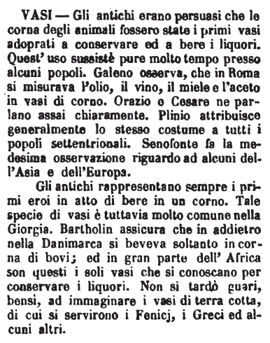 | Vasi - Gli antichi erano persuasi che le corna degli animali fossero state i primi vasi adoprati a conservare ed a bere i liquori. Quest'uso sussistè pure molto tempo presso alcuni popoli. Galeno osserva, che in Roma si misurava l'olio, il vino, il miele e l'aceto in vasi di corno. Orazio e Cesare ne parlano assai chiaramente. Plinio attribuisce generalmente lo stesso costume a tutti i popoli settentrionali. Senofonte fa la medesima osservazione riguardo ad alcuni dell'Asia e dell'Europa.
