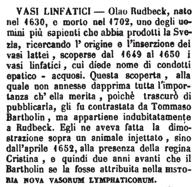| Vasi linfatici - Olao Rudbeck, nato nel 1630, e morto nel 1702, uno degli uomini più sapienti che abbia prodotti la Svezia, ricercando l'origine e l'inserzione dei vasi lattei, scoperse dal 1649 al 1650 i vasi linfatici, cui diede nome di condotti epatico - acquosi. Questa scoperta, alla quale non annesse dapprima tutta l'importanza ch'ella merita, poichè trascurò di pubblicarla, gli fu contrastata da Tommaso Bartholin, ma appartiene indubitatamente a Rudbeck. Egli ne aveva fatta la dimostrazione sopra un animale injettato, sino dall'aprile 1652, alla presenza della regina Cristina, e quindi due anni avanti che il Bartholin se la fosse attribuita nella historia nova vasorum lymphaticorum. [immagine] |