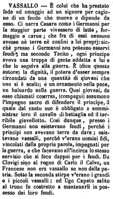 | Vassallo, Suddito - Vassallo, titolo feudale, importava Persona che giurava fedeltà e omaggio al signore, per un qualche potere che aveva in feudo da esso; e da alcuni zelanti è usata tuttora per Suddito, che significa solamente quella soggezione sociale che ciascuno ha verso il capo dello Stato, in quanto esso rappresenta la suprema autorità della legge. [immagine] |