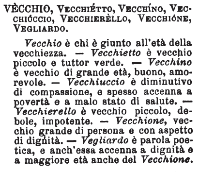 | Vecchio, Vecchietto, Vecchino, Vecchiuccio, Vecchierello, Vecchione, Vegliardo - Vecchio è chi è giunto all'età della vecchiezza. - Vecchietto è vecchio piccolo e tuttor verde. - Vecchino è vecchio di grande età, buono, amorevole. - Vecchiuccio è diminutivo di compassione, e spesso accenna a povertà e a malo stato di salute. - Vecchierello è vecchio piccolo, debole, impotente. - Vecchione, vecchio grande di persona e con aspetto di dignità. - Vegliardo è parola poetica, e anch'essa accenna a dignità e a maggiore età anche del Vecchione. [immagine] |