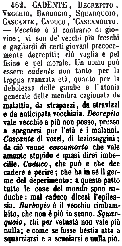| Cadente, Decrepito, Vecchio, Barbogio, Squarquoio, Cascante, Caduco, Cascamorto - Vecchio è il contrario di giovine; vi son de' vecchi più freschi e gagliardi di certi giovani precocemente decrepiti; ciò vaglia e pel fisico e pel morale. Un uomo può essere cadente non tanto per la troppa avanzata età, quanto per la debolezza delle gambe e l'atonia generale delle membra cagionata da malattia, da strapazzi, da stravizzi e da anticipata vecchiaia. Decrepito vale vecchio a più non posso, presso a spegnersi per l'età e i malanni. Cascante di vezzi, di leziosaggini; da ciò venne cascamorto che vale amante stupido e quasi direi imbecille. Caduco, che può e che dee cadere e perire; che ha in sè il germe del deperimento: a questo patto tutte le cose del mondo sono caduche: mal caduco dicesi l'epilessia. Barbogio è il vecchio rimbambito, che non è più in senno. Squarquoio, chi per vetustà non vale più nulla; e come se fosse bestia atta a squarciarsi e a scuoiarsi e nulla più. [immagine] |