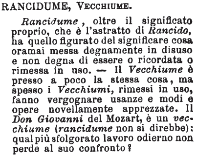 | Rancidume, Vecchiume - Rancidume, oltre il significato proprio, che è l'astratto di Rancido, ha quello figurato del significare cosa oramai messa degnamente in disuso e non degna di essere o ricordata o rimessa in uso. - Il Vecchiume è presso a poco la stessa cosa, ma spesso i Vecchiumi, rimessi in uso, fanno vergognare usanze e modi e opere novellamente apprezzate. Il Don Giovanni del Mozart, è un vecchiume (rancidume non si direbbe): qual più sfolgorato lavoro odierno non perde al suo confronto? [immagine] |