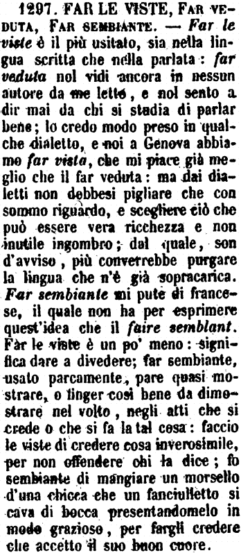 | Far le viste, Far veduta, Far sembiante - Far le viste è il più usitato, sia nella lingua scritta che nella parlata: far veduta nol vidi ancora in nessun autore da me letto, e nol sento a dir mai da chi si studia di parlar bene; lo credo modo preso in qualche dialetto, e noi a Genova abbiamo far vista, che mi piace già meglio che il far veduta: ma dai dialetti non debbesi pigliare che con sommo riguardo, e scegliere ciò che può essere vera ricchezza e non inutile ingombro; dal quale, son d'avviso, più converrebbe purgare la lingua che n'è già sopracarica. Far sembiante mi pute di francese, il quale non ha per esprimere quest'idea che il faire semblant. Far le viste è un po' meno: significa dare a divedere; far sembiante, usato parcamente, pare quasi mostrare, o finger così bene da dimostrare nel volto, negli atti che si crede o che si fa la tal cosa: faccio le viste di credere cosa inverosimile, per non offendere chi la dice; fo sembiante di mangiare un morsello d'una chicca che un fanciulletto si cava di bocca presentandomelo in modo grazioso, per fargli credere che accetto il suo buon cuore. [immagine] |