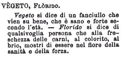 | Vegeto, Florido - Vegeto si dice di un fanciullo che vien su bene, che è sano e forte secondo l'età. - Florido si dice di qualsivoglia persona che alla freschezza delle carni, al colorito, al brio, mostri di essere nel fiore della sanità e della forza. [immagine] |