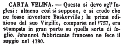 Carta velina - Questa si deve agl'Inglesi: almeno così si suppone, e si crede che ne fosse inventore Baskerville; la prima edizione del suo Virgilio, comparsa nel 1757, era stampata in gran parte su quella sorta di foglio. Johannot fabbricante francese ne fece il saggio nel 1780. [immagine]