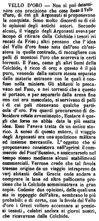 | Vello d’oro - Non si può determinare con precisione che cosa fosse il Vello d'oro, di cui gli Argonauti si proponevano la conquista. Sono molto discordi su di ciò le opinioni degli antichi autori. Secondo alcuni, il viaggio degli Argonauti aveva per iscopo di ritirare dalla Colchide i tesori ivi recati da Friso; altri pensano che l'idea del Vello d'oro fosse nata dall'uso ch'esisteva in quelle contrade, di raccogliere con pelli di montoni l'oro che scorreva in certi torrenti. Il Faso, come gli altri fiumi della Colchide, è ricco di oro; e questo è il più puro, venendo dalla natura stessa separato dalle materie estranee con le quali è confuso nella miniera. Gli abitanti lo pescavano nel Faso, e nei torrenti che a questo si portano, e per separarlo dalla arena fine con cui era mescolato, si servivano di pelli i di cui peli ritenevano qualche particola d'oro. Fra quanti procurarono di delucidare cotale avvenimento, Eustace è quegli che forse ne abbia data la più esatta idea. Esso l'aveva tratta da un antico storico. A senso di questo autore, il viaggio degli Argonauti era una spedizione militare ed insieme mercantile. L'oggetto che si proponevano consisteva nell'aprirsi il commercio del Pont'Eussino, e assicurarselo nel tempo stesso mediante alcuni stabilimenti commerciali. Verrone crede che tal favola traesse origine da un viaggio intrapreso da varj abitanti della Grecia onde andare a comprare le lane ed altre pelliccerie preziose che la Colchide somministrava in gran copia. Codeste due opinioni, delle quali una sta in appoggio dell'altra, sembrano le più probabili; e di certo, con la favola del Vello d'oro i Greci vollero accennare ai preziosi tessuti, celebri ancora ai giorni nostri, che ricavavano dalla Colchide. [immagine] |