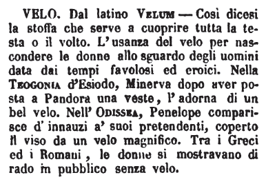 | Velo - Dal latino Velum - Così dicesi la stoffa che serve a cuoprire tutta la testa o il volto. L'usanza del velo per nascondere le donne allo sguardo degli uomini data dai tempi favolosi ed eroici. Nella Teogonia d'Esiodo, Minerva dopo aver posta a Pandora una veste, l'adorna di un bel velo. Nell'Odissea, Penelope comparisce d'innauzi a' suoi pretendenti, coperto il viso da un velo magnifico. Tra i Greci ed i Romani, le donne si mostravano di rado in pubblico senza velo. [immagine] |