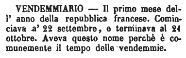 | Vendemmiario - Il primo mese dell'anno della repubblica francese. Cominciava a' 22 settembre, e terminava al 21 ottobre. Aveva questo nome perchè è comunemente il tempo delle vendemmie. [immagine] |