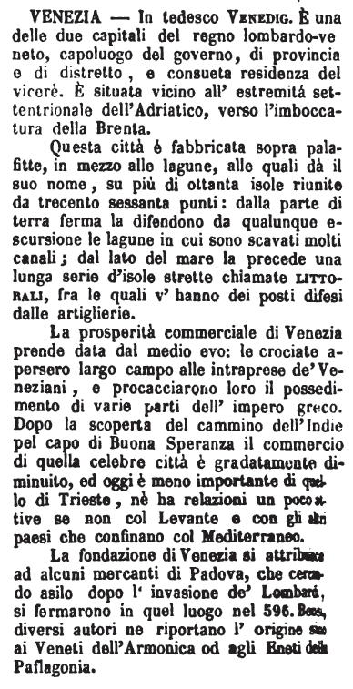 | Venezia - In tedesco Venedig. E' una delle due capitali del regno lombardo-veneto, capoluogo del governo, di provincia e di distretto, e consueta residenza del vicerè. E' situata vicino all'estremità settentrionale dell'Adriatico, verso l'imboccatura della Brenta.