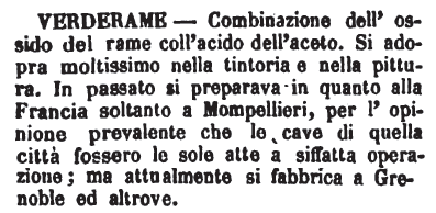 | Verderame - Combinazione dell'ossido del rame coll'acido dell'aceto. Si adopra moltissimo nella tintoria e nella pittura. In passato si preparava in quanto alla Francia soltanto a Mompellieri, per l'opinione prevalente che le cave di quella città fossero le sole atte a siffatta operazione; ma attualmente si fabbrica a Grenoble ed altrove. [immagine] |