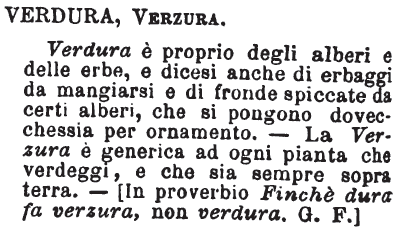 | Verdura, Verzura - Verdura è proprio degli alberi e delle erbe, e dicesi anche di erbaggi da mangiarsi e di fronde spiccate da certi alberi, che si pongono dovecchessia per ornamento. - La Verzura è generica ad ogni pianta che verdeggi, e che sia sempre sopra terra. - [In proverbio Finchè dura fa verzura, non verdura. G. F.] [immagine] |