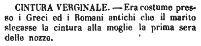 | Cintura verginale - Era costume presso i Greci ed i Romani antichi che il marito slegasse la cintura alla moglie la prima sera delle nozze. [immagine] |