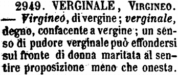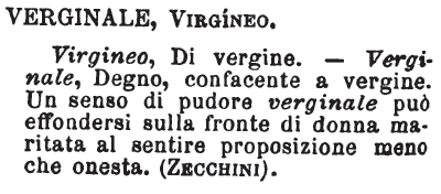 | Verginale, Virgineo - Virgineo, Di vergine. - Verginale, Degno, confacente a vergine. Un senso di pudore verginale può effondersi sulla fronte di donna maritata al sentire proposizione meno che onesta. (Zecchini). [immagine] |