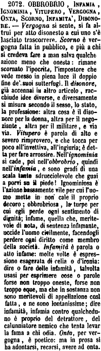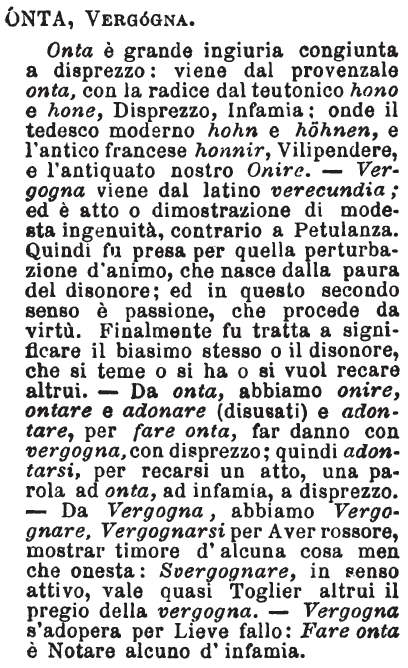 | Onta, Vergogna - Onta è grande ingiuria congiunta a disprezzo: viene dal provenzale onta, con la radice dal teutonico hono e hone, Disprezzo, lnfamia; onde il tedesco moderno hohn e höhnen, e l‘antico francese honnir, Vilipendere, e l'antiquato nostro Onire. — Vergogna viene dal latino verecundia; ed è atto o dimostrazione di modesta ingenuità, contrario a Petulanza. Quindi fu presa per quella perturbazione d'animo, che nasce dalla paura del disonore; ed in questo secondo senso è passione, che procede da virtù. Finalmente fu tratta a significare il biasimo stesso o il disonore, che si teme o si ha o si vuol recare altrui. — Da onta, abbiamo onire, ontare e adonare (disusati) e adontare, per fare onta, far danno con vergogna, con disprezzo; quindi adontarsi, per recarsi un atto, una parola ad onta, ad infamia, a disprezzo. — Da Vergogna, abbiamo Vergognare, Vergognarsi per Aver rossore, mostrar timore d‘alcuna cosa men che onesta: Svergognare, in senso attivo, vale quasi Toglier altrui il pregio della vergogna. — Vergogna s’adopera per Lieve fallo: Fare onta è Notare alcuno d‘infamia. [immagine] |