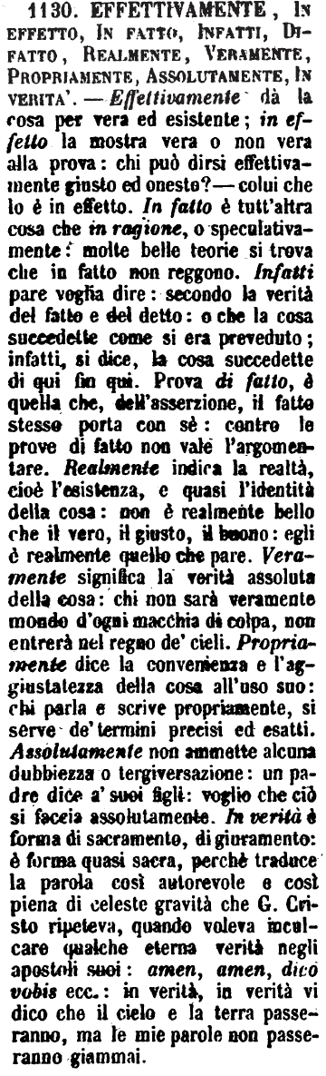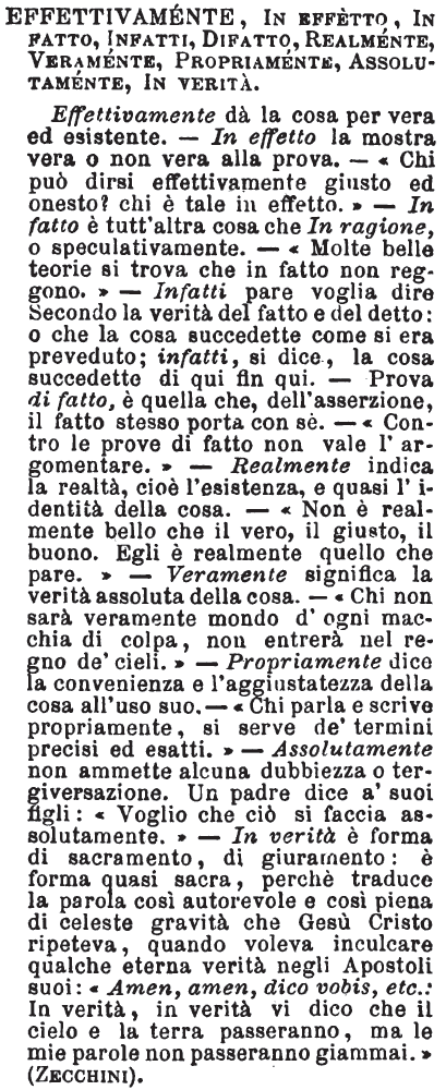| Effettivamente, In effetto, In fatto, Infatti, Difatto, Realmente, Veramente, Propriamente, Assolutamente, In verità - Effettivamente dà la cosa per vera ed esistente. - In effetto la mostra vera o non vera alla prova. - « Chi può dirsi effettivamente giusto ed onesto? chi è tale in effetto. » - In fatto è tutt'altra cosa che In ragione, o speculativamente. - « Molte belle teorie si trova che in fatto non reggono. » - Infatti pare voglia dire Secondo la verità del fatto e del detto: o che la cosa succedette come si era preveduto; infatti, si dice, la cosa succedette di qui fin qui. - Prova di fatto, è quella che, dell'asserzione, il fatto stesso porta con se. - « Contro le prove di fatto non vale l'argomentare. » - Realmente indica la realtà, cioè l'esistenza, e quasi l'identità della cosa. - « Non è realmente bello che il vero, il giusto, il buono. Egli è realmente quello che pare. » - Veramente significa la verità assoluta della cosa. - « Chi non sarà veramente mondo d'ogni macchia di colpa, non entrerà nel regno de' cieli. » - Propriamente dice la convenienza e l'aggiustatezza della cosa all'uso suo. - « Chi parla e scrive propriamente, si serve de' termini precisi ed esatti. » - Assolutamente non ammette alcuna dubbiezza o tergiversazione. Un padre dice a' suoi figli: « Voglio che ciò si faccia assolutamente. » - In verità è forma di sacramento, di giuramento: è forma quasi sacra, perchè traduce la parola così autorevole e così piena di celeste gravità che Gesù Cristo ripeteva, quando voleva inculcare qualche eterna verità negli Apostoli suoi: « Amen, amen, dico vobis, etc.: In verità, in verità vi dico che il cielo e la terra passeranno, ma le mie parole non passeranno giammai. » (Zecchini). [immagine] |