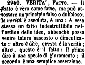 | Verità, Fatto - Il fatto è vero come fatto, ma può attestare un principio falso o dubbioso; la verità è assoluta, è una: è essa stessa un fatto indestruttibile nell'ordine delle idee, abbenchè possa venire talora nascosto o dimenticato: altro è dire, questa è la verità; altro, questo è il fatto: Il primo dire è una specie di giuramento; il secondo è una semplice asserzione. [immagine] |