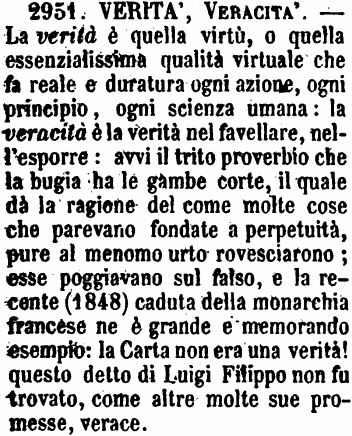 | Verità, Veracità - La verità è quella virtù, o quella essenzialissima qualità virtuale che fa reale e duratura ogni azione, ogni principio, ogni scienza umana: la veracità è la verità nel favellare, nell'esporre: avvi il trito proverbio che la bugia ha le gambe corte, il quale dà la ragione del come molte cose che parevano fondate a perpetuità, pure al menomo urto rovesciarono; esse poggiavano sul falso, e la recente (1848) caduta della monarchia francese ne è grande e memorando esempio: la Carta non era una verità! questo detto di Luigi Filippo non fu trovato, come altre molte sue promesse, verace. [immagine] |
