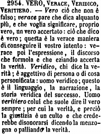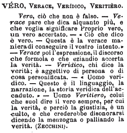 | Vero, Verace, Veridico, Veritiero - Vero, ciò che non è falso. - Verace pare che dica alquanto più, e che voglia significare Proprio vero, un vero accertato. - «Ciò che dico è vero. -Questa è la verace maniera di conseguire il vostro intento.» - Verace poi l'espressione, il discorso che formola e che eziandio accerta la verità. - Veridico, chi dice la verità; è aggettivo di persona o di cosa personificata. - «Uomo veridico. - Questo è il linguaggio, la narrazione, la storia veridica dell'accaduto.» - Uomo Veritiero, colui che suol dire il vero sempre, per cui la verità, e perciò la giustizia, è un culto, e che crederebbe disonorarsi dicendo la menzogna o palliando la verità. (Zecchini). [immagine] |