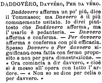 | Daddovero, Davvero, Per da vero - Daddovero afferma un po' più, dice il Tommaseo; ma Davvero è il più comunemente usitato. Io direi piuttosto che Daddovero afferma, ma l'usarlo è pedanteria. - Davvero afferma e conferma. - Per davvero afferma e conferma con più efficacia. Spesso Davvero e Per davvero significano cosa fatta con fermo proposito e non per pura dimostrazione. - «Ora comincia a dir davvero,» cioè si è messo all'opera con tutto l'ardore. - «Non so se dice per celia o per davvero.» [immagine] |