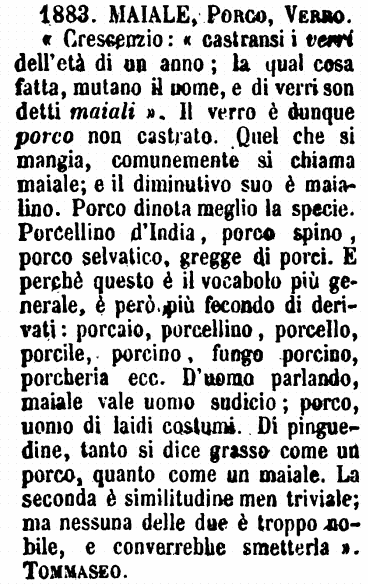 | Maiale, Porco, Verro - « Crescenzio: « castransi i verri dell'età di un anno; la qual cosa fatta, mutano il nome, e di verri son detti maiali ». Il verro è dunque porco non castrato. Quel che si mangia, comunemente si chiama maiale; e il diminutivo suo è maialino. Porco dinota meglio la specie. Porcellino d'India, porco spino, porco selvatico, gregge di porci. E perchè questo è il vocabolo più generale, è però più fecondo di derivati: porcaio, porcellino, porcello, porcile, porcino, fungo porcino, porcheria ecc. D'uomo parlando, maiale vale uomo sudicio; porco, uomo di laidi costumi. Di pinguedine, tanto si dice grasso come un porco, quanto come un maiale. La seconda è similitudine men triviale; ma nessuna delle due è troppo nobile, e converrebbe smetterla ». Tommaseo. [immagine] |