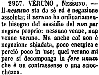 | Nessuno, Niuno, Alcuno, Veruno, Neppur uno - Poco differiscono. Tra Nessuno e Niuno non c'è divario, salvo che nel maggiore o minor uso; l'essere Niuno della lingua scelta, e l'esserci nel Nessuno un poco più di efficacia. - Alcuno è meno, e non esclude se non unito alla negativa, cosa che non fanno gli altri. - Più efficace anche di Nessuno è Veruno, che è il Vel unus de' Latini, ed equivale al Neppur uno, che ha più forza esclusiva di tutti, conforme al latino ne unus quidem. [immagine] |