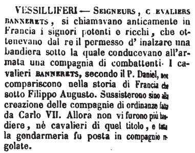 | Vessilliferi - Seigneurs, chevaliers bannerets, si chiamavano anticamente in Francia i signori potenti e ricchi, che ottenevano dal re il permesso d'inalzare una bandiera sotto la quale conducevano all'armata una compagnia di combattenti. I cavalieri bannerets, secondo il P. Daniel, non compariscono nella storia di Francia che sotto Filippo Augusto. Sussisterono sino alla creazione delle compagnie di ordinanze fatta da Carlo VII. Allora non vi furono più bandiere, nè cavalieri di quel titolo, e tutta la gendarmeria fu posta in compagnie regolate. [immagine] |