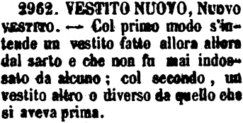 | Vestito nuovo, Nuovo vestito - Col primo modo s'intende un vestito fatto allora allora dal sarto e che non fu mai indossato da alcuno; col secondo, un vestito altro o diverso da quello che si aveva prima. [immagine] |