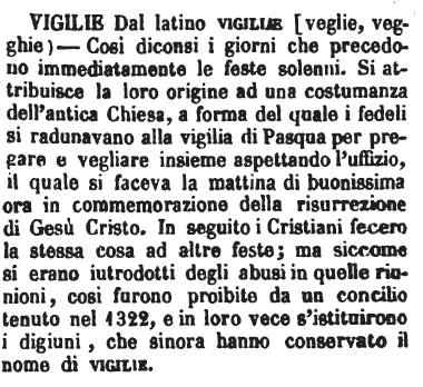 | Vigile dal latino Vigiliae (veglie, veghie) - Così diconsi i giorni che precedono immediatamente le feste solenni. Si attribuisce la loro origine ad una costumanza dell'antica Chiesa, a forma del quale i fedeli si radunavano alla vigilia di Pasqua per pregare e vegliare insieme aspettando l'uffizio, il quale si faceva la mattina di buonissima ora in commemorazione della risurrezione di Gesù Cristo. In seguito i Cristiani fecero la stessa cosa ad altre feste; ma siccome si erano iutrodotti degli abusi in quelle riunioni, così furono proibite da un concilio tenuto nel 1322, e in loro vece s'istituirono i digiuni, che sinora hanno conservato il nome di vigilie. [immagine] |