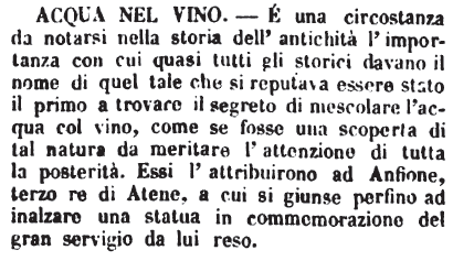 | Acqua nel vino - E' una circostanza da notarsi nella storia dell'antichità l'importanza con cui quasi tutti gli storici davano il nome di quel tale che si reputava essere stato il primo a trovare il segreto di mescolare l'acqua col vino, come se fosse una scoperta di tal natura da meritare l'attenzione di tutta la posterità. Essi l'attribuirono ad Anfione, terzo re di Atene, a cui si giunse perfino ad inalzare una statua in commemorazione del gran servigio da lui reso. [immagine] |
