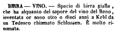 | Birra - Vino - Specie di birra gialla, che ha alquanto del sapore del vino del Reno, inventata or sono otto o dieci anni a Kehl da un tedesco chiamato Schlossen. E' molto rinomata. [immagine] |