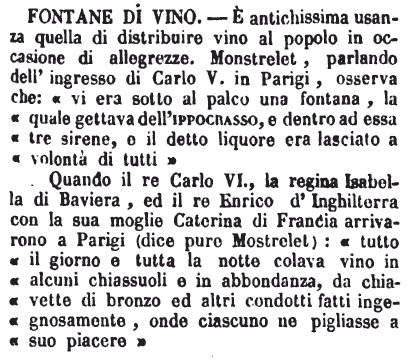 | Fontane di vino - E' antichissima usanza quella di distribuire vino al popolo in occasione di allegrezze. Monstrelet, parlando dell'ingresso di Carlo V. in Parigi, osserva che: «vi era sotto al palco una fontana, la quale gettava dell'ippocrasso, e dentro ad essa tre sirene, e il detto liquore era lasciato a volontà di tutti»