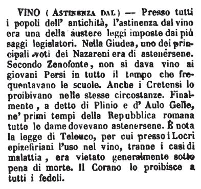 | Vino (astinenza dal) - Presso tutti i popoli dell'antichità, l'astinenza dal vino era una della austere leggi imposte dai più saggi legislatori. Nella Giudea, uno dei principali voti dei Nazareni era di astenersene. Secondo Zenofonte, non si dava vino ai giovani Persi in tutto il tempo che frequentavano le scuole. Anche i Cretensi lo proibivano nelle stesse circostanze. Finalmente, a detto di Plinio e d'Aulo Gelle, ne' primi tempi della Repubblica romana tutte le donne dovevano astenersene. È nota la legge di Teleuco, per cui presso i Locri epizefiriani l'uso del vino, tranne i casi di malattia, era vietato generalmente sotto pena di morte. Il Corano lo proibisce a tutti i fedeli. [immagine] |