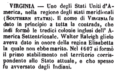 | Virginia - Uno degli Stati Uniti d'America, nella regione degli stati meridionali (Southern states). Il nome di Virginia fu dato in principio a tutta la contrada, che indi formò le tredici colonie inglesi dell'America Settentrionale. Walter Raleigh glielo aveva dato in onore della regina Elisabetta la quale non ebbe marito. Nel 1607 si formò il primo stabilimento nel territorio corrispondente allo Stato attuale, e che spesso fu avversato dagli Indiani. [immagine] |