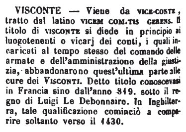 | Visconte - Viene da vice-conte, tratto dal latino vicem comitis gerens. Il titolo di visconte si dice in principio ai luogotenenti o vicarj dei conti, i quali incaricati al tempo stesso del comando delle armate e dell'amministrazione della giustizia, abbandonarono quest'ultima parte alle cure dei Visconti. Detto titolo conoscevasi in Francia sino dall'anno 819. sotto il regno di Luigi Le Debonnaire. In Inghilterra, tale qualificazione cominciò a comparire soltanto verso il 1430. [immagine] |