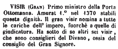 | Visir (Gran) - Primo ministro della Porta Ottomanna. Amurat 1.° nel 1370 stabilì questa dignità. Il gran visir nomina a tutte le cariche dell'impero, fuorchè a quelle di giudicatura. Ha sotto di se altri sei visir, che sono consiglieri del Divano, ossia del consiglio del Gran Signore. [immagine] |