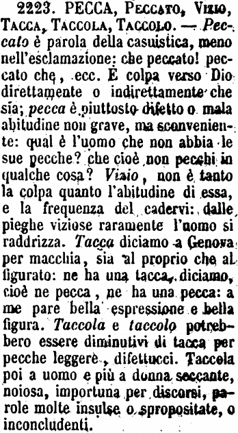 | Pecca, Peccato, Vizio, Tacca, Taccola, Taccolo - Peccato è parola della casuistica, meno nell'esclamazione: che peccato! peccato che, ecc. È colpa verso Dio direttamente o indirettamente che sia; pecca è piuttosto difetto o mala abitudine non grave, ma sconveniente: qual è l'uomo che non abbia le sue pecche? che cioè non pecchi in qualche cosa? Vizio, non è tanto la colpa quanto l'abitudine di essa, e la frequenza del cadervi: dalle pieghe viziose raramente l'uomo si raddrizza. Tacca diciamo a Genova per macchia, sia al proprio che al figurato: ne ha una tacca, diciamo, cioè ne pecca, ne ha una pecca: a me pare bella espressione e bella figura. Taccola e taccolo potrebbero essere diminutivi di tacca per pecche leggere, difettucci. Taccola poi a uomo e più a donna seccante, noiosa, importuna per discorsi, parole molte insulse o spropositate, o inconcludenti. [immagine] |