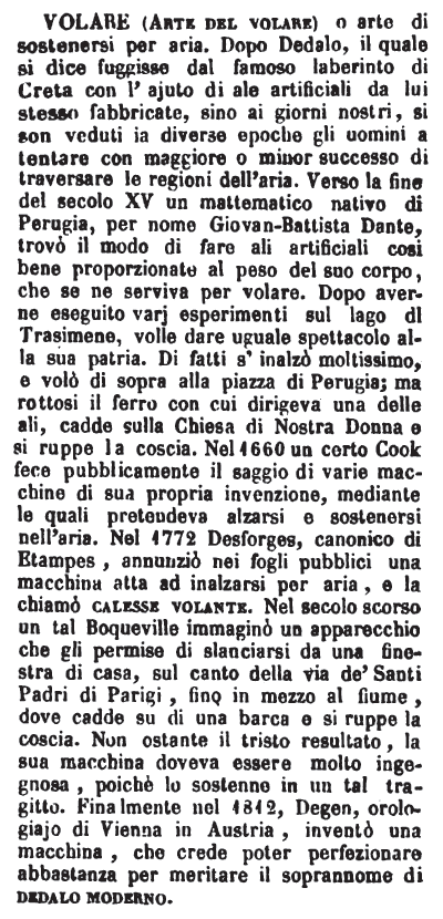 | Volare (arte del volare) - o arte di sostenersi per aria. Dopo Dedalo, il quale si dice fuggisse dal famoso laberinto di Creta con l'ajuto di ale artificiali da lui stesso fabbricate, sino ai giorni nostri, si son veduti ia diverse epoche gli uomini a tentare con maggiore o minor successo di traversare le regioni dell'aria. Verso la fine del secolo XV un mattematico nativo di Perugia, per nome Giovan-Battista Dante, trovò il modo di fare ali artificiali così bene proporzionate al peso del suo corpo, che se ne serviva per volare. Dopo averne eseguito varj esperimenti sul lago dl Trasimene, volle dare uguale spettacolo alla sua patria. Di fatti s'inalzò moltissimo, e volò di sopra alla piazza di Perugia; ma rottosi il ferro con cui dirigeva una delle ali, cadde sulla Chiesa di Nostra Donna e si ruppe la coscia. Nel 1660 un certo Cook fece pubblicamente il saggio di varie macchine di sua propria invenzione, mediante le quali pretendeva alzarsi e sostenersi nell'aria. Nel 1772 Dosforges, canonico di Etampes, annunziò nei fogli pubblici una macchina atta ad inalzarsi per aria, e la chiamò calesse volante. Nel secolo scorso un tal Boqueville immaginò un apparecchio che gli permise di slanciarsi da una finestra di casa, sul canto della via de' Santi Padri di Parigi, fino in mezzo al fiume, dove cadde su di una barca e si ruppe la coscia. Non ostante il tristo resultato, la sua macchina doveva essere molto ingegnosa, poichè lo sostenne in un tal tragitto. Finalmente nel 1812, Degen, orologiajo di Vienna in Austria, inventò una macchina, che crede poter perfezionare abbastanza per meritare il soprannome di dedalo moderno. [immagine] |