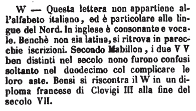 | W - Questa lettera non appartiene all'alfabeto italiano, ed è particolare alle lingue del Nord. In Inglese è consonante e vocale. Benché non sia latina, si ritrova in parecchie iscrizioni. Secondo Mabillon, i due V V ben distinti nel secolo nono furono confusi soltanto nel duodecimo col complicare le loro aste. Bensì si riscontra il W in un diploma francese di Clovigi III alla fine del secolo VII. [immagine] |
